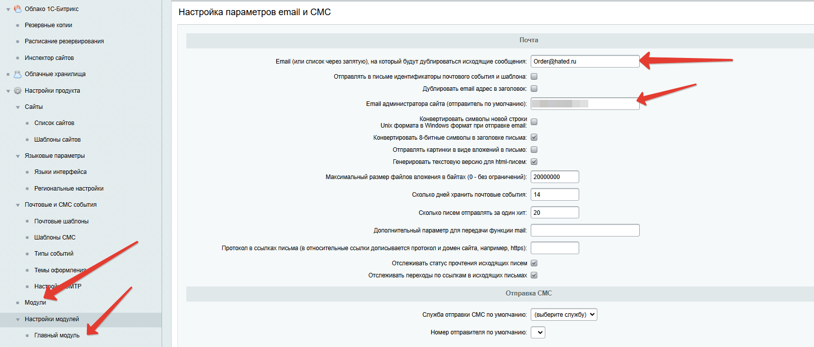 Далее, здесь же переходим в подпункт «настройки модулей», и нажимаем «главный модуль». Здесь у нас с вами есть вкладка почта и СМС. Нажимаем сюда, вводим наш email, вводим наш email сюда, в принципе этого достаточно. То есть, двух полей достаточно.